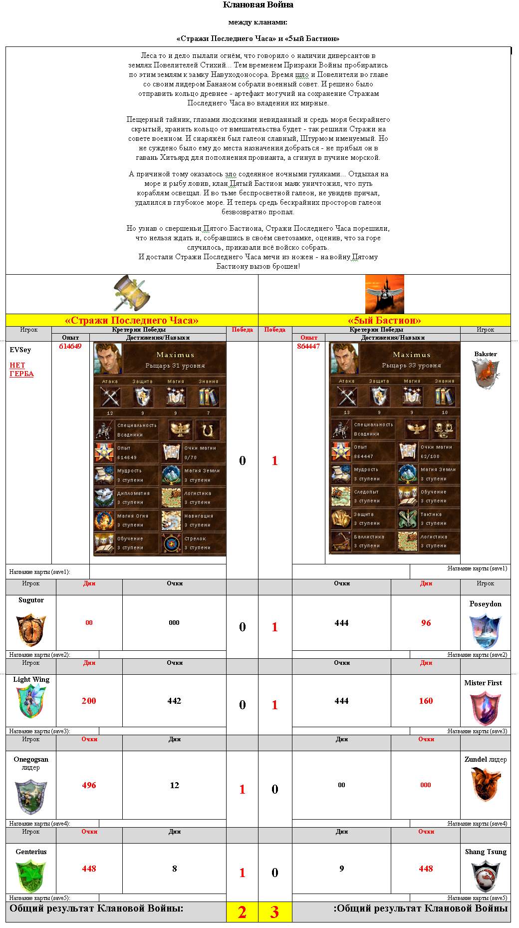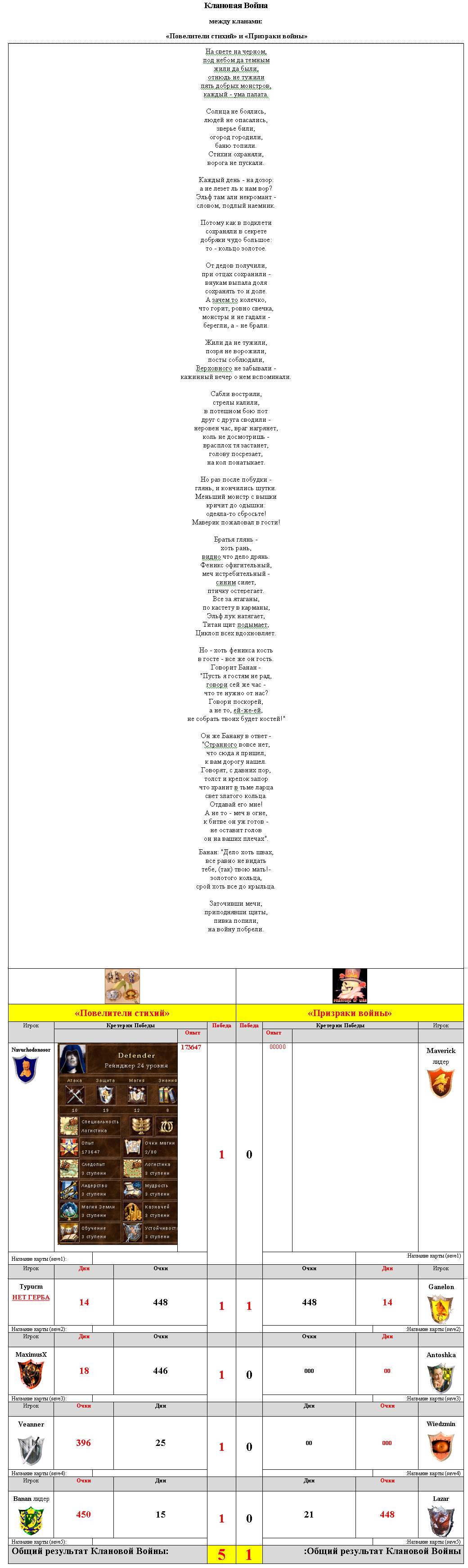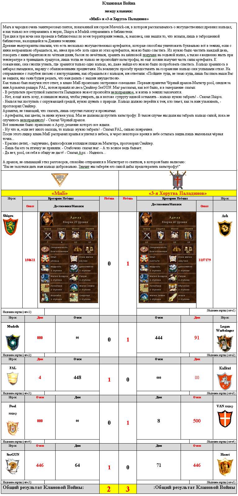 Today we have sumed up the results of the Big Clan War, during which we could watch the battles between six clans. Also, according to these results, the clans' property was transferred. You may watch the results here,here and here.